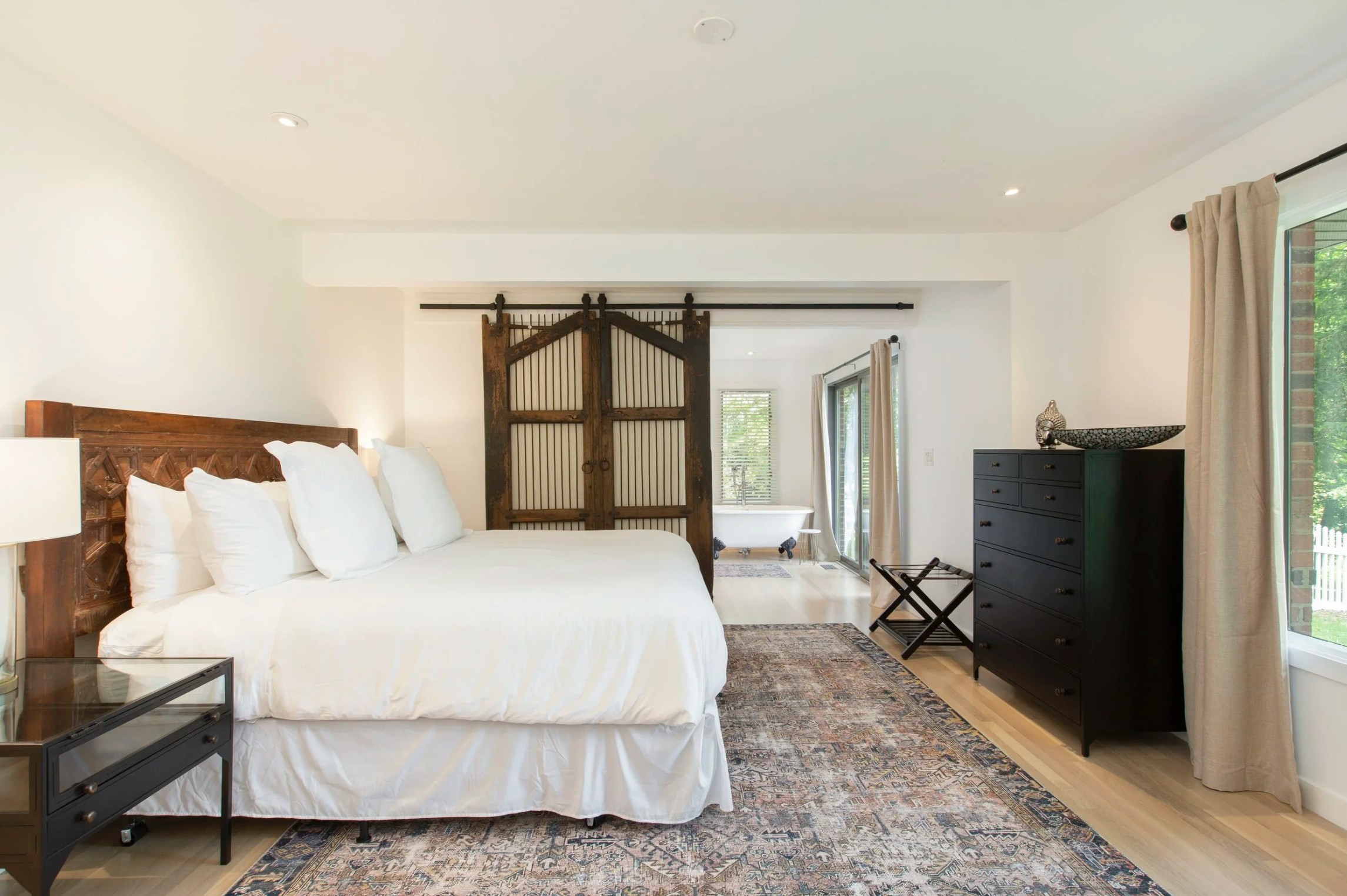 Stay at an elegant mountain hideaway just outside Asheville in Hendersonville, North Carolina. Set against the sweeping backdrop of the Blue Ridge Mountains, the property blends natural beauty with thoughtful design. Expansive views, beautifully appointed accommodations, and a curated collection of contemporary art throughout the grounds create a setting that feels both sophisticated and serene from the moment you arrive.